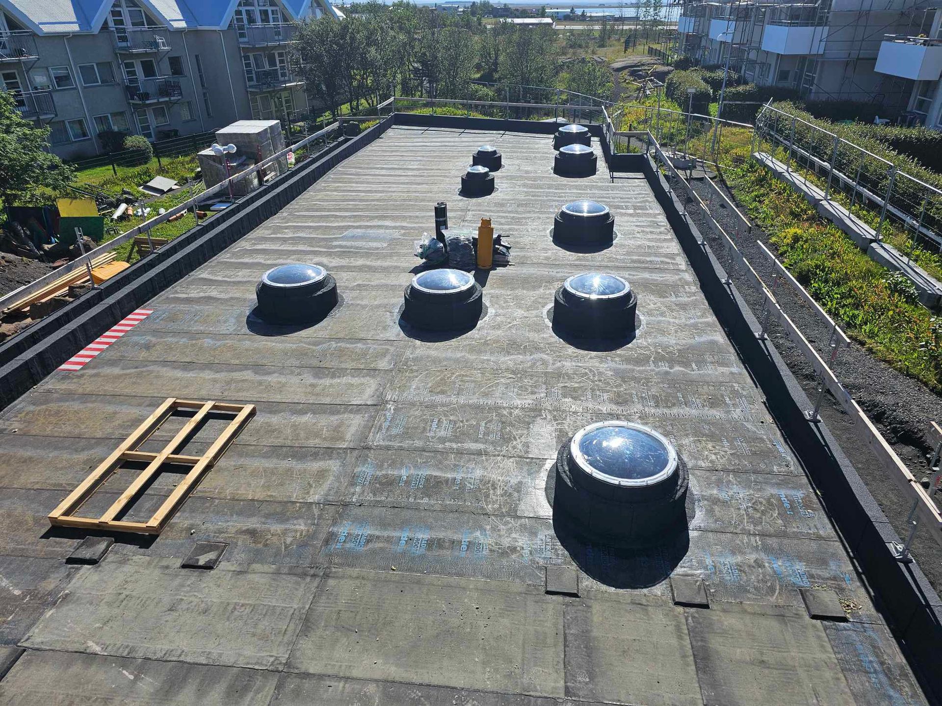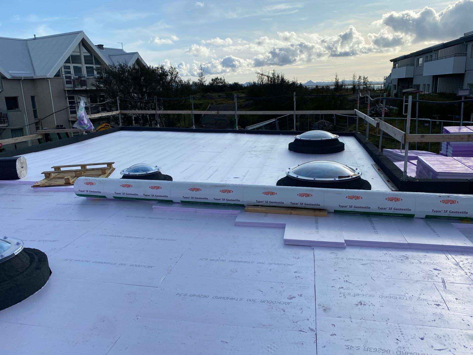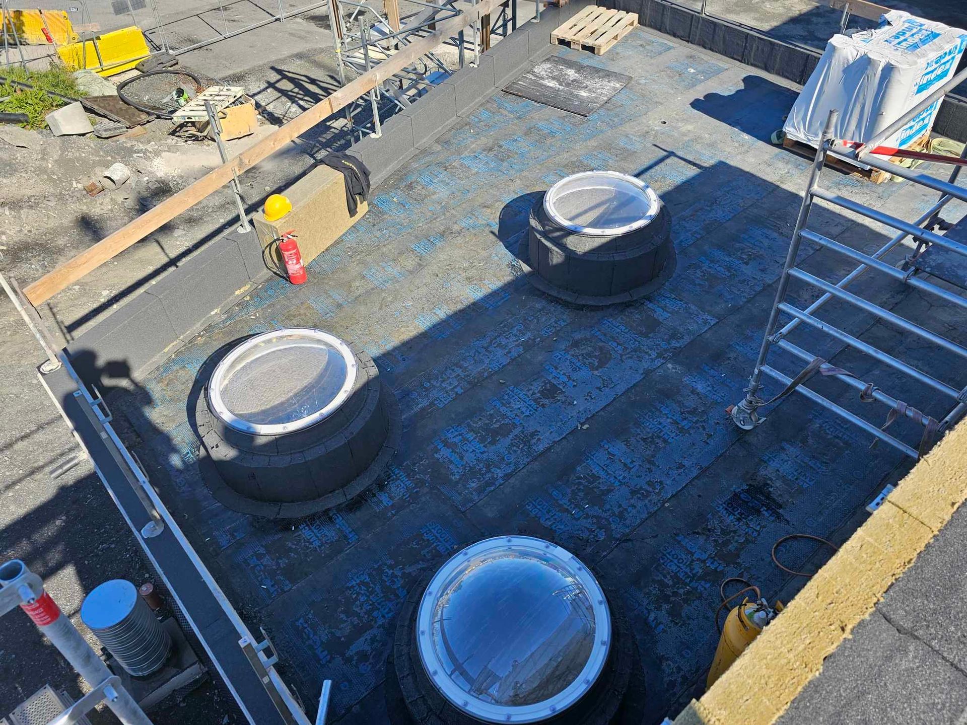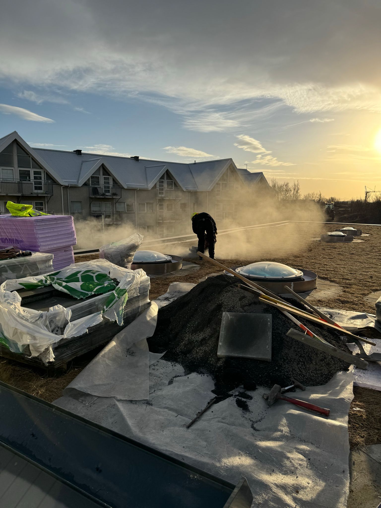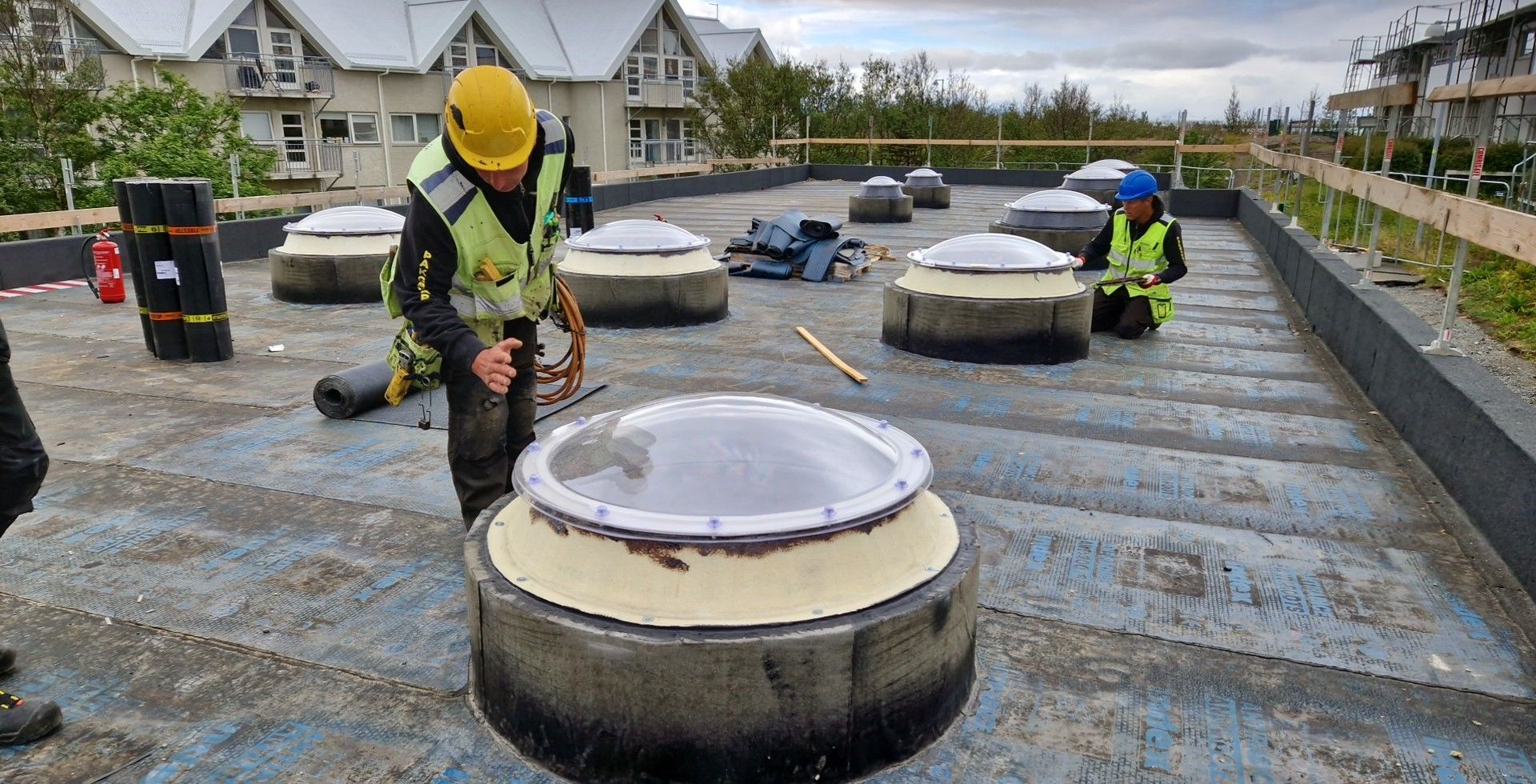 Við lögðum fyrsta lag af þakdúknum í beinu framhaldi svo vatn innandyra yrði í algjöru lágmarki.