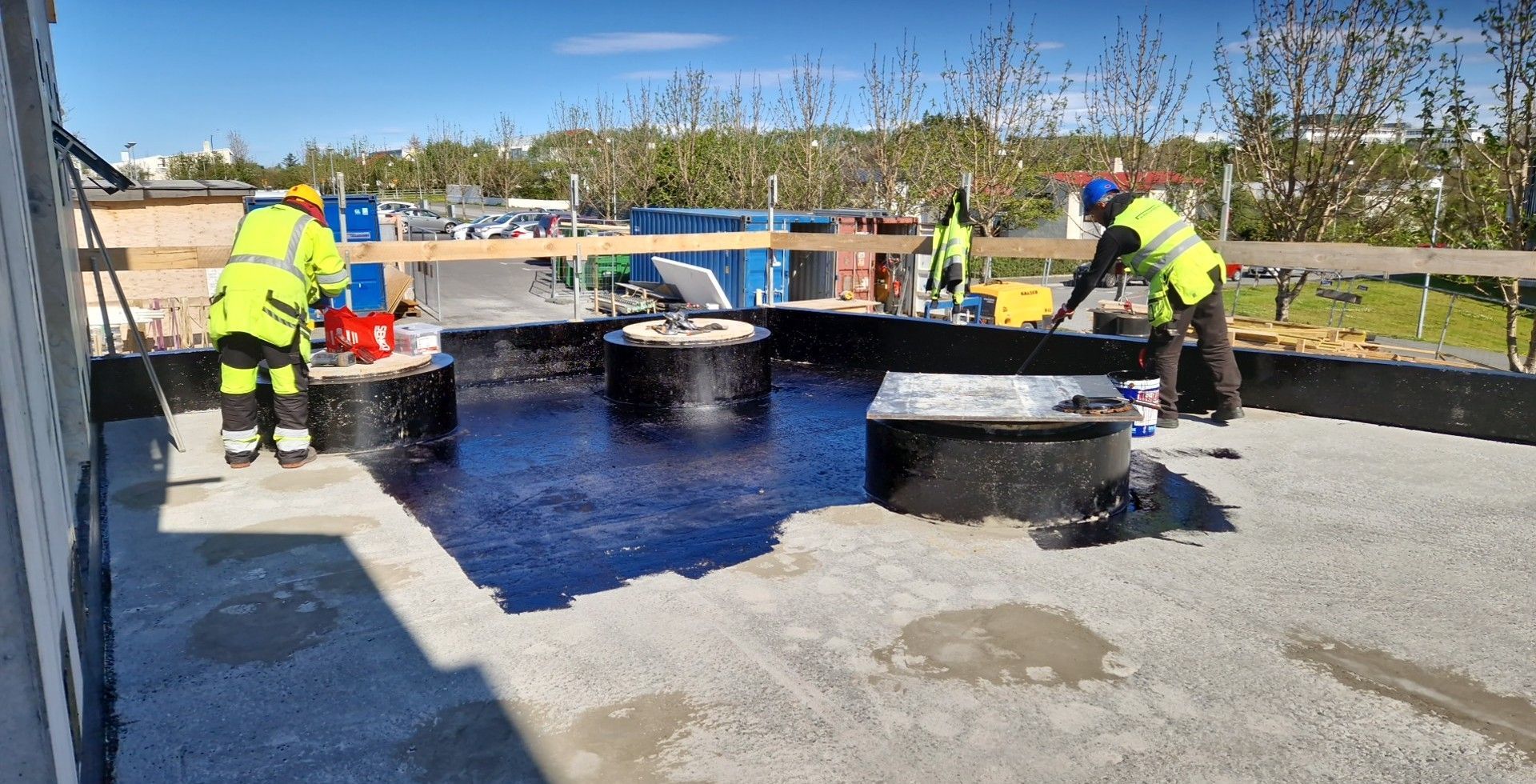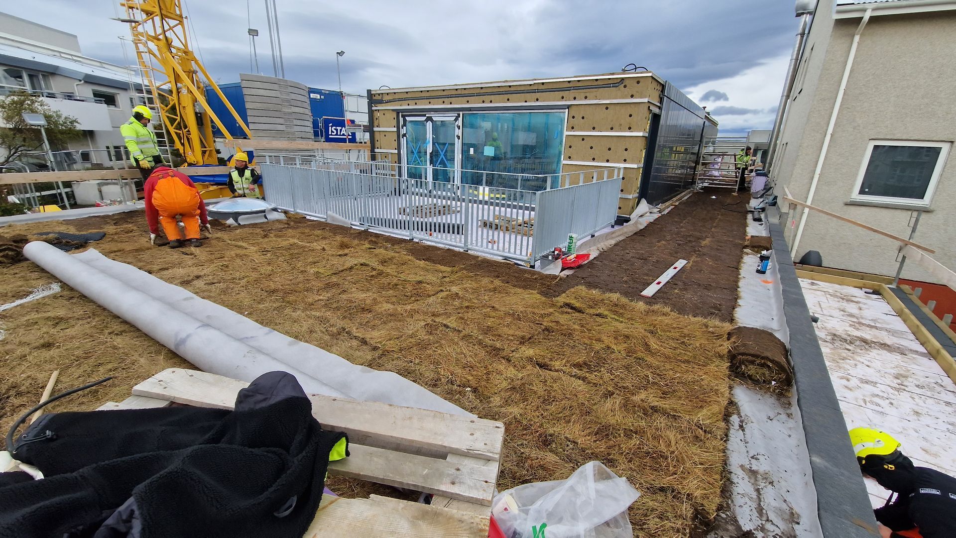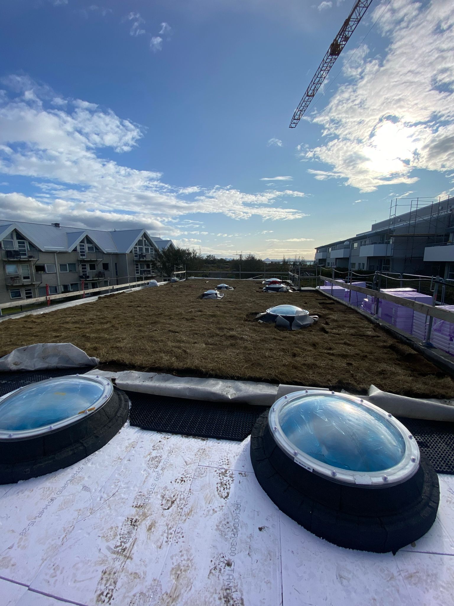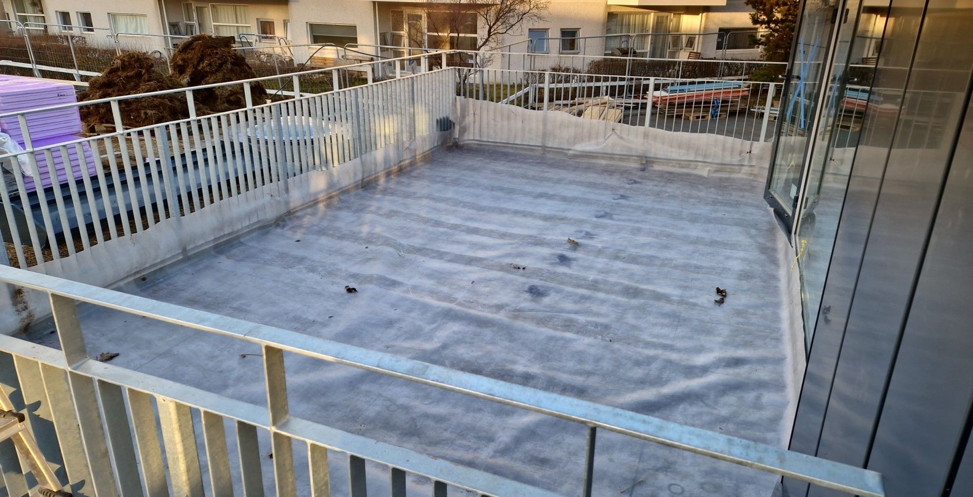Við lögðum fyrsta lag af þakdúknum í beinu framhaldi svo vatn innandyra yrði í algjöru lágmarki.