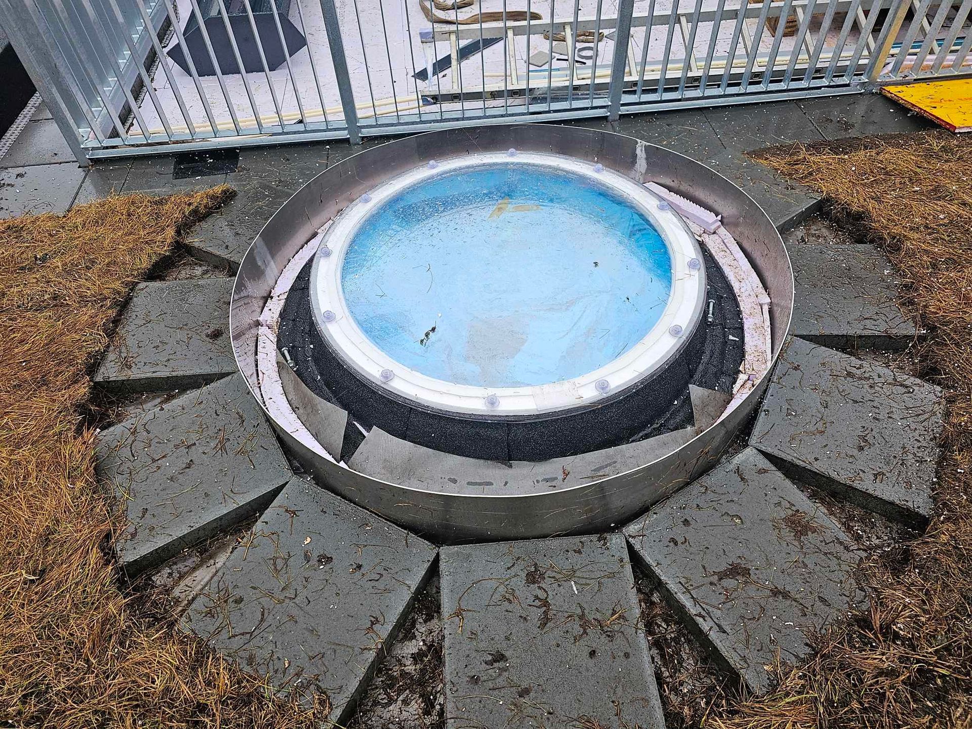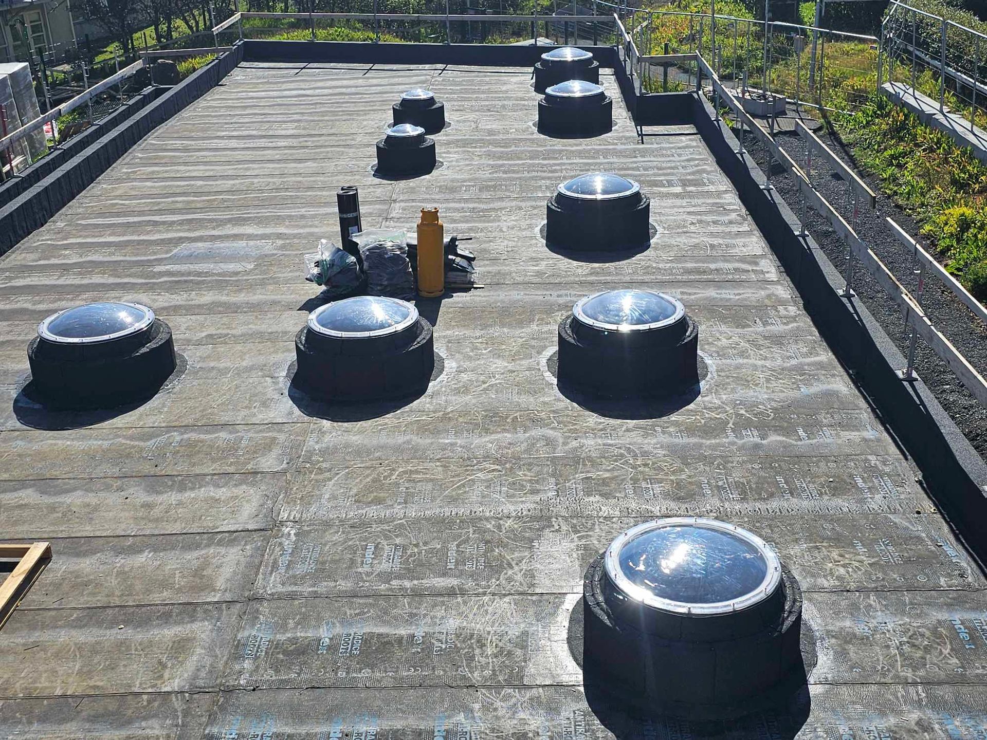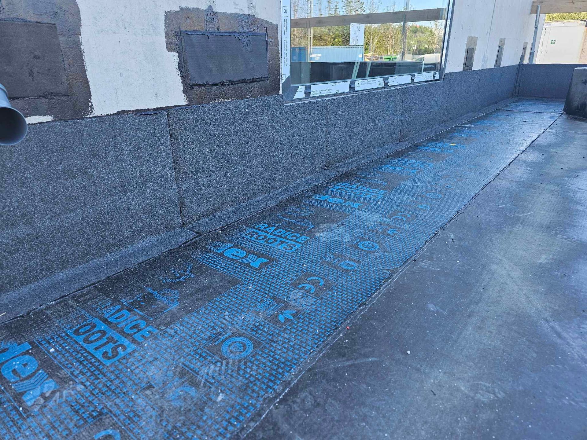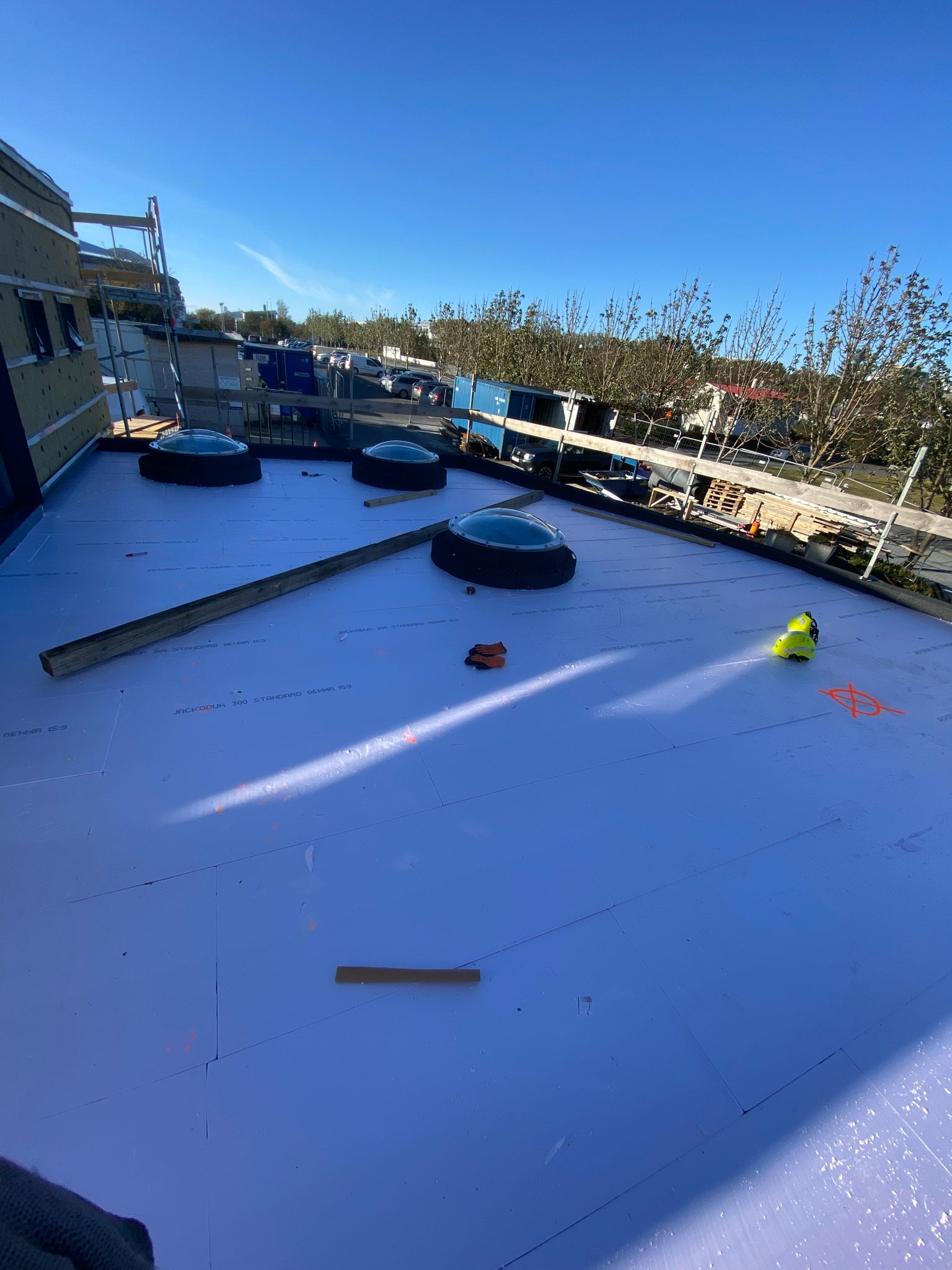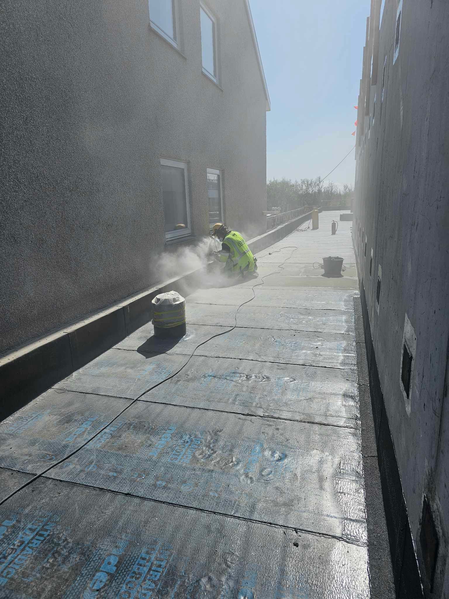 Við lögðum fyrsta lag af þakdúknum í beinu framhaldi svo vatn innandyra yrði í algjöru lágmarki.