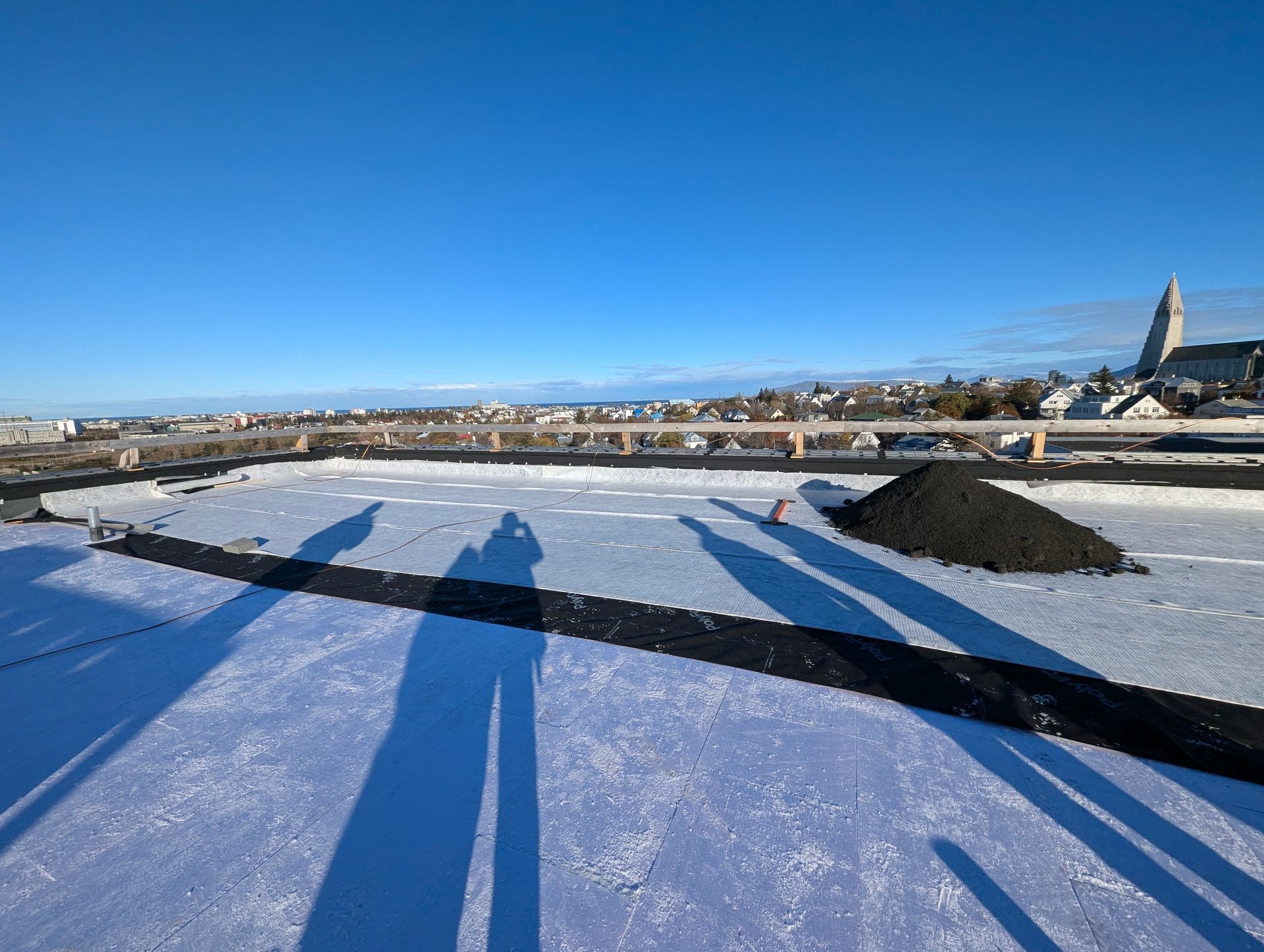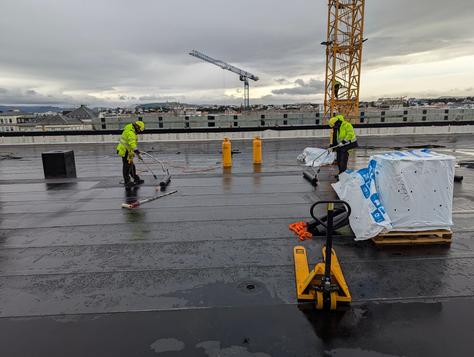 Við lögðum fyrsta lag af þakdúknum í beinu framhaldi svo vatn innandyra yrði í algjöru lágmarki.